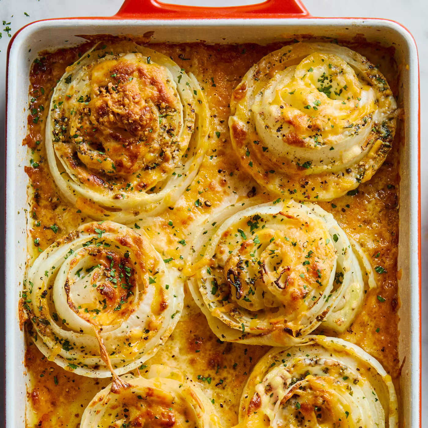 Make sure to separate the rings from one another when placing them in the baking dish. It's the best way for the seasonings and cheeses to penetrate the onions as they bake.